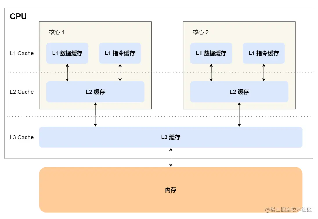 假设一个8核的cpu,每个核都有自己独立L1 Cache(1级缓存)、L2 Cache(2级缓存),而L3 Cache(3级缓存)是8核共享的;