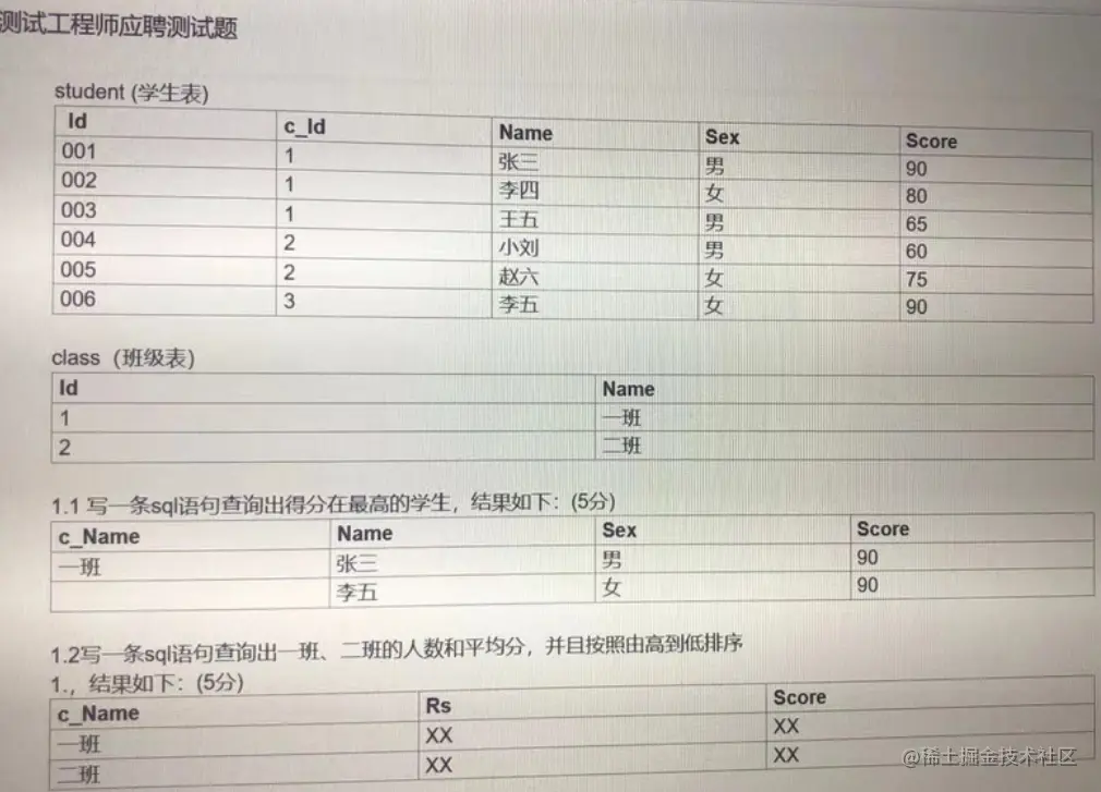1、依据以下学生表、班级表,按要求写 SQL