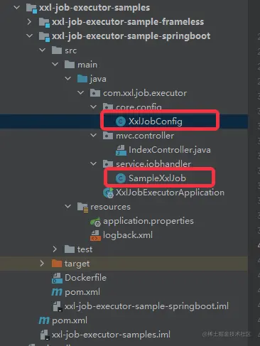 在官方自带的 springboot executor 代码中,主要有两个类:XxlJobConfig、SampleXxlJob,如下图所示。前者是 executor 的配置类,后者是向 Spring 容器注入 Job 和对应的 JobHandler。