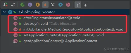 从上面三个接口的作用可以看出,XxlJobSpringExecutor 是在 afterSingletonsInstantiated 中执行初始化操作,在 destroy 方法中执行销毁操作: