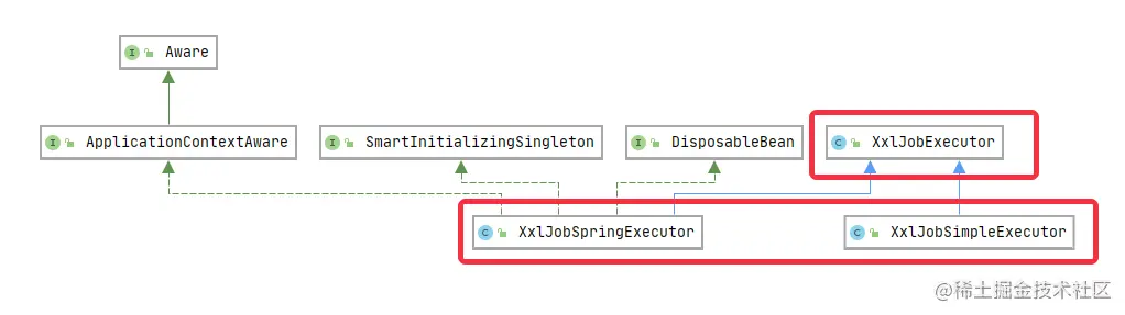 executor 代码中有两个主要的 excutor 类:XxlJobSimpleExecutor、XxlJobSpringExecutor,两者的功能大同小异(后面只介绍 XxlJobSpringExecutor),都继承自 XxlJobExecutor,三者的 UML 图如下所示: