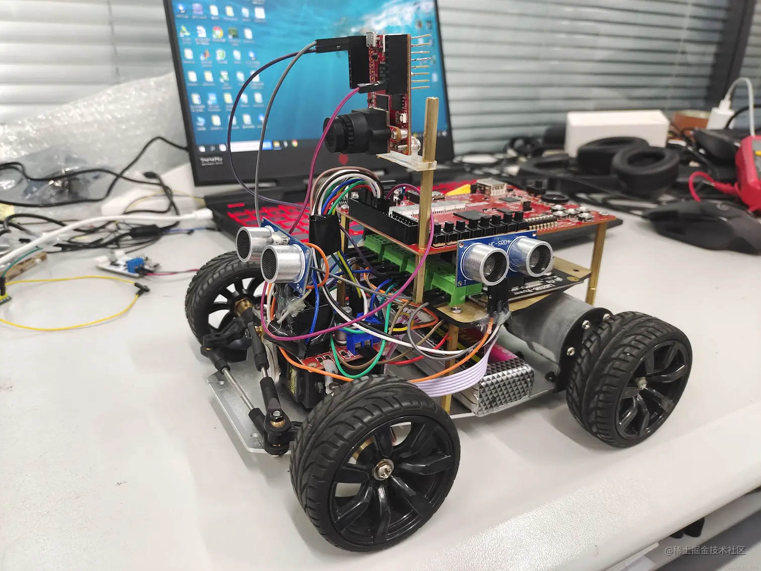 4.转动方向判断:通过左右两个超声波测距比较,若舵机要转动角度,则往超声波测距大的方向转动,实现避障功能。