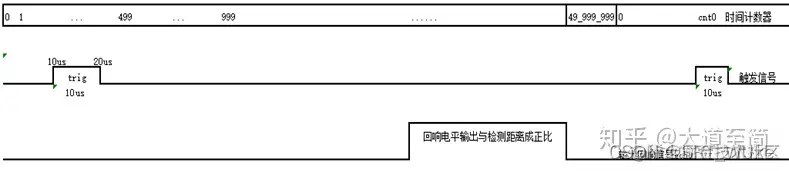 定时发布trig,并检测传来的echo信号,计数并转换为距离。