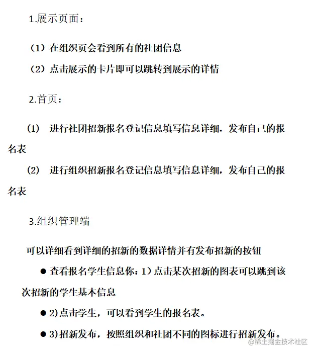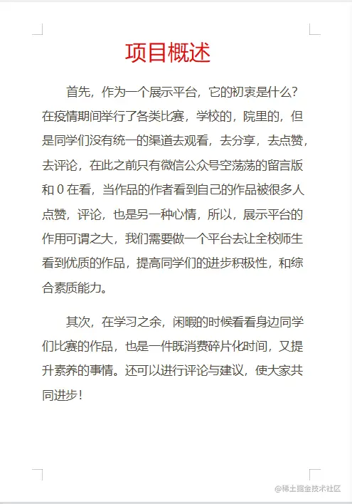 - 经历:在2021年1月,我接到了工作室考核项目,也就是作品展示平台,这是我第一次经历了一个基本项目的开发流程,从产品,到接口,再到视觉图,一个完整的项目终于在2月末落地,而作为项目组长的我也在这次考核中经历了蜕变,这也是我进步的开始。