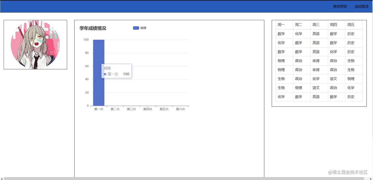 - 项目要求:一个中学管理系统,包含了学生端与老师端,学生端包括成绩查询,成绩图表显示,进步数据,老师端包括了班级成绩管理,上分功能,课表排序等。