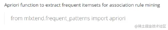 在实际开始前我们先来了解这个mlxtend中的包怎么用的。在mlxtend官网上演示了如何实现关联规则的计算,我们来看一下总共有三步: