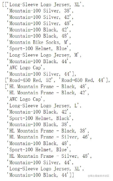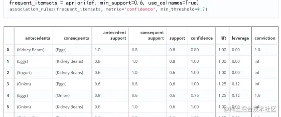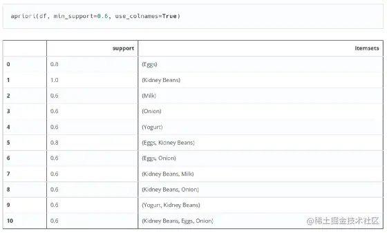 然而上面有个问题,上面返回的结果集是数字,其实是df表里每个项(item)的索引,这对于后面处理比较方便,但是如果只想用这个结果。为了增加可读性,可以使用use_colnames=True的参数来显示原本的商品名。