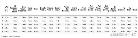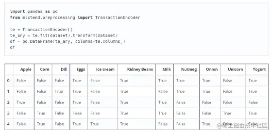 可以看到形成了输入数据,我们再使用TransactionEncoder对数据进行处理,生成每个商品(项)的独热编码DataFrame格式: