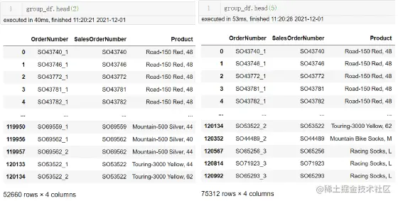 如果大家会写SQL的话应该知道groupby分组必须与聚合函数一起结合使用,因为它是一个mapreduce的过程。如果按订单号分组而没有使用聚合函数的话,在SQL Server中会报错,在Mysql中只会返回第一行数据。而这里直接使用了groupby分组没有用聚合函数,这不会有什么问题吗?我们来看一下结果group_df: