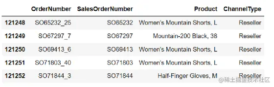 数据集中有121253条数据,总共有四个字段,SalesOrderNumber是指订单号;ordernumber是指子订单号,下换线加数字表明是订单的第几个子订单,每个订单号下可能有一个或多个子订单,而每个子订单是不重复的,对应一个产品;Product是指商品名称。