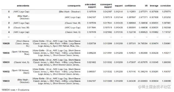上面这张表显示共找到了169034个可供选择的关联规则,列名分别是什么意思呢?