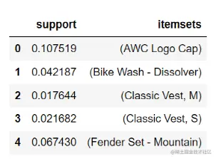 算法生成的结果也是DataFrame格式的频繁项集,它会把频繁1项集、频繁2项集、频繁3项集等所有大于等于最小支持度的结果返回。这里显示的是频繁1项集。