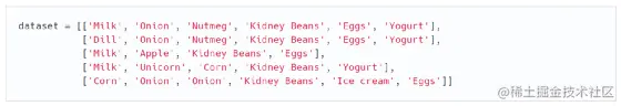 它使用TransactionEncoder包来将输入数据转换成我们需要的形式。以下是转换的代码和结果: