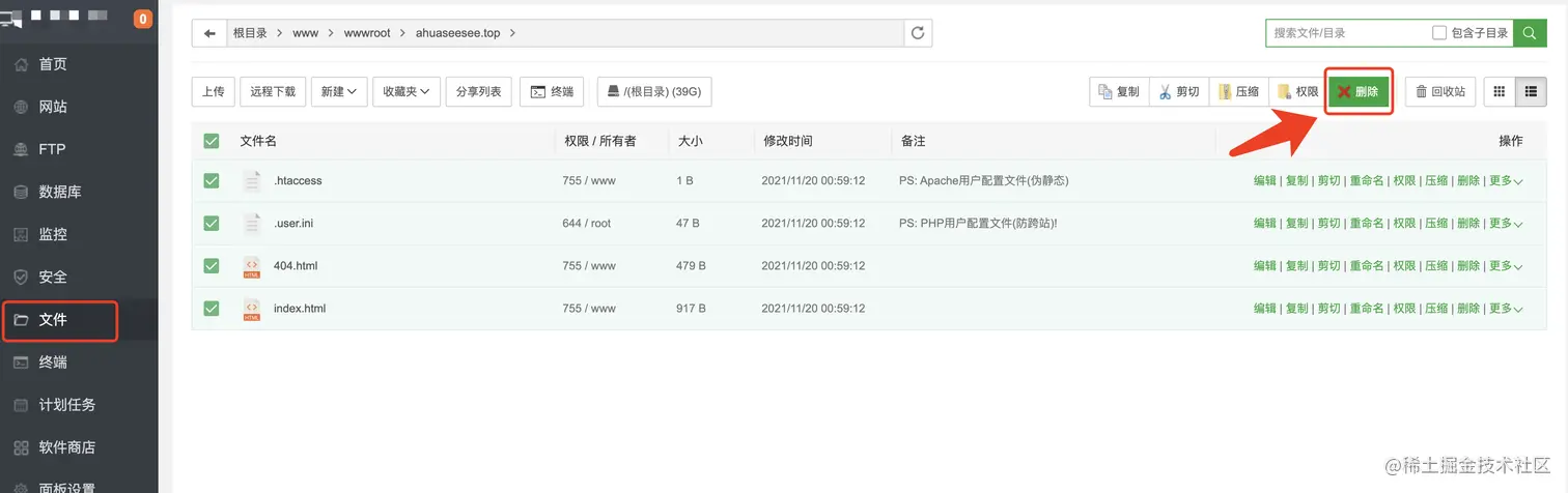 进入到网站目录后,我们会看到默认文件,我们可以全选,然后删除文件,.user.ini无法删除,先不管。