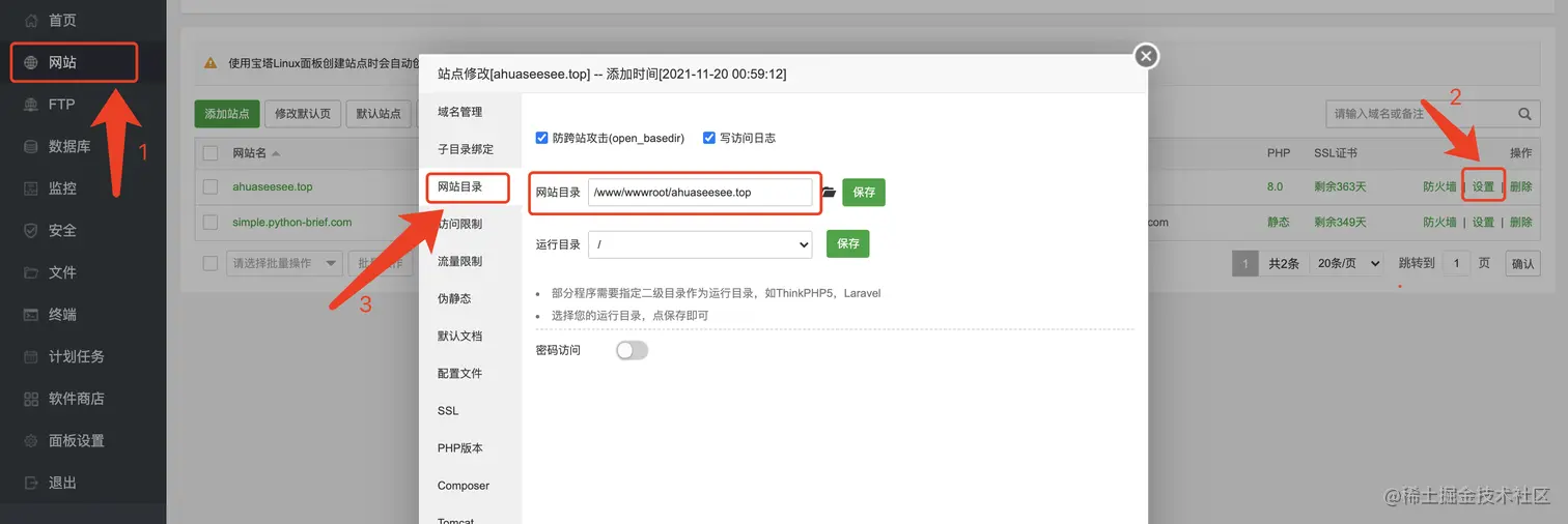 首先我们需要进入网站目录,如果忘记了网站目录在哪里,不慌,点击网站-> 设置 -> 网站目录,就可以看到啦~