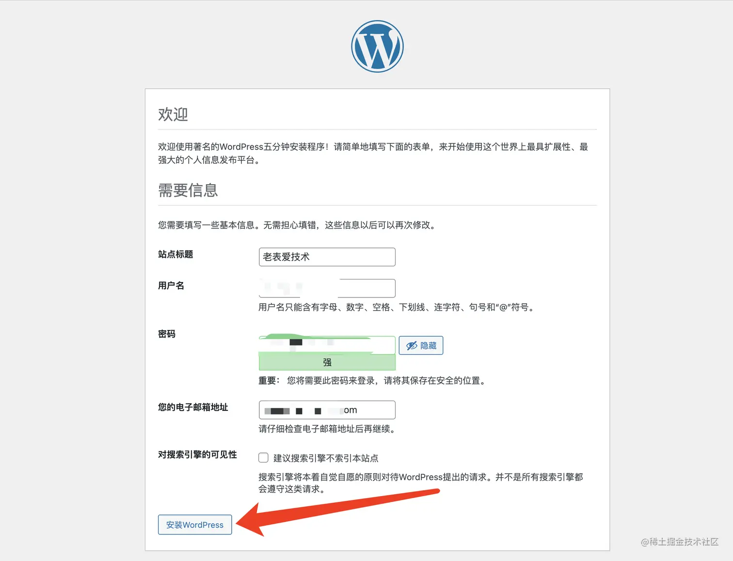 然后正在的站点配置就来啦~设置站点标题(建议和备案时写一样,好像会查),用户名、密码、邮箱填写好后,直接点击安装WordPress即可正式开始安装。