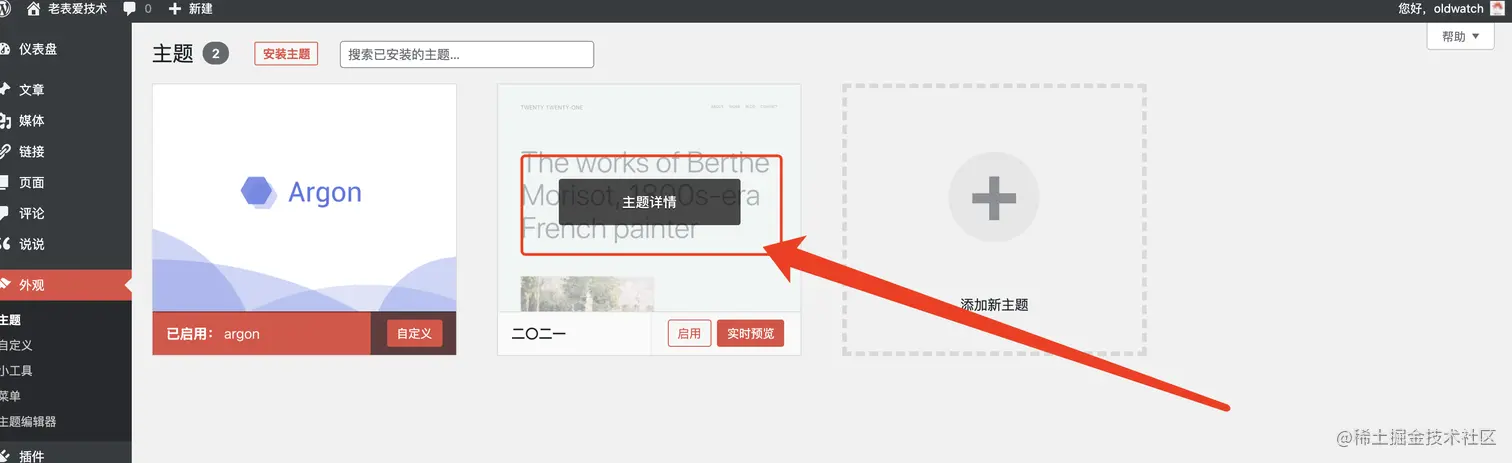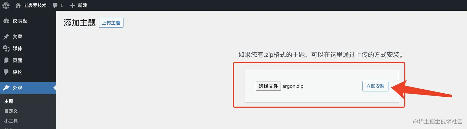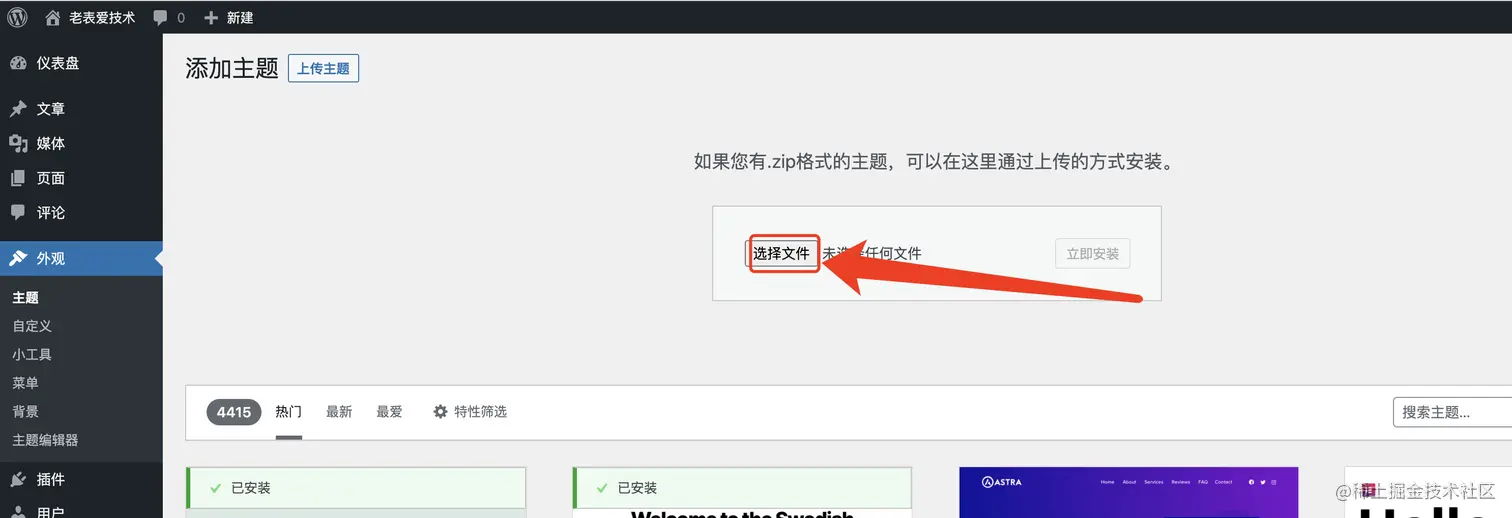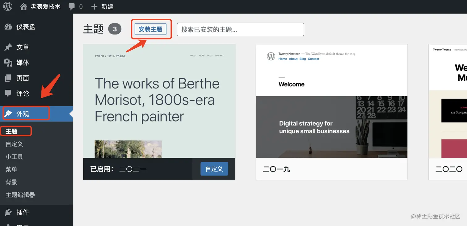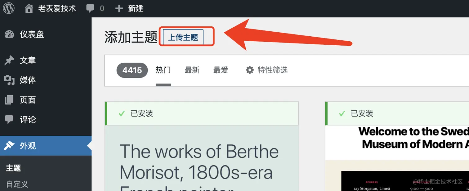 最简单的,我们可以先换一个主题(初始主题确实太朴实了~),我们在Wordpress后台直击外观-主题,然后点击页面中的安装主题,就可以进入主题选择页面了。