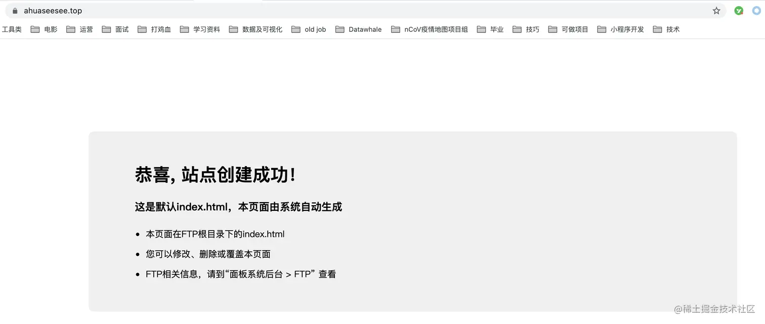 设置好域名解析,大概过1-5分钟(解析有延迟),我们直接访问域名,就可以看到站点设置成功提醒啦~到这里我们配置好了网站基本设置,接下来需要配置WordPress站点了。