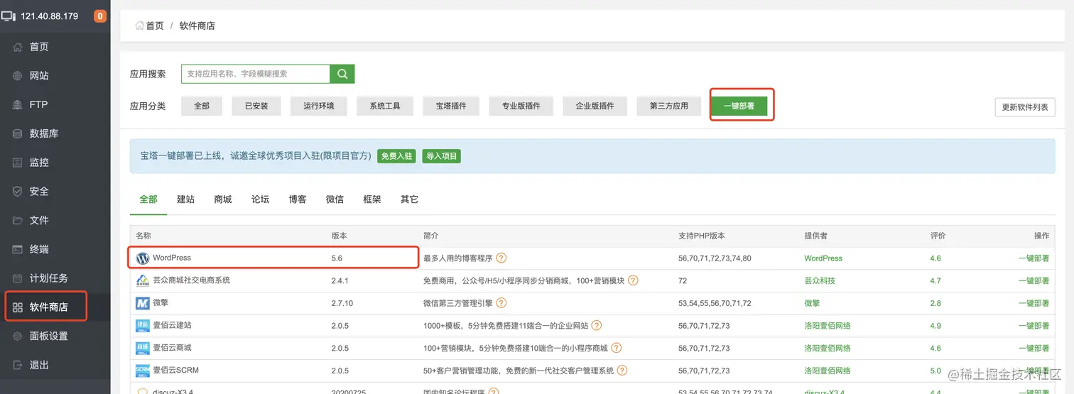 不知道为啥,安装PHP之前,在宝塔面板的软件商店里我怎么都找不到WordPress安装包,但是安装完PHP8.0后,我又刷新了几下,就出来了,奇怪,也不知道是不是之前没安装PHP的原因。