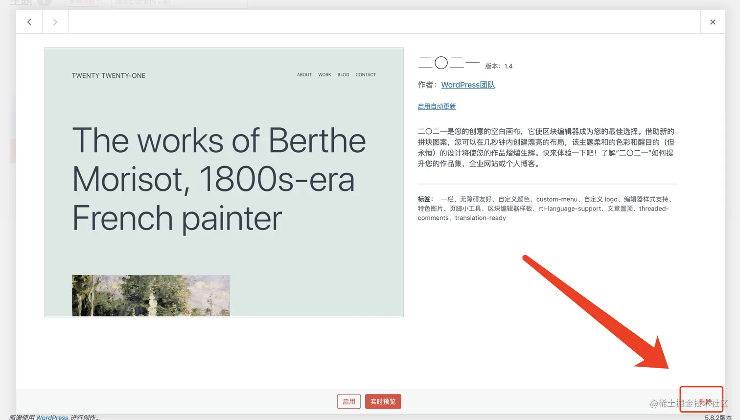 选择安装好新的主题后,我们可以把其他主题删除,在主题页面,点击不需要的主题进入主题详情页面,右下脚会有一个小小的删除按钮,虽然是红色,但是真的小~~~