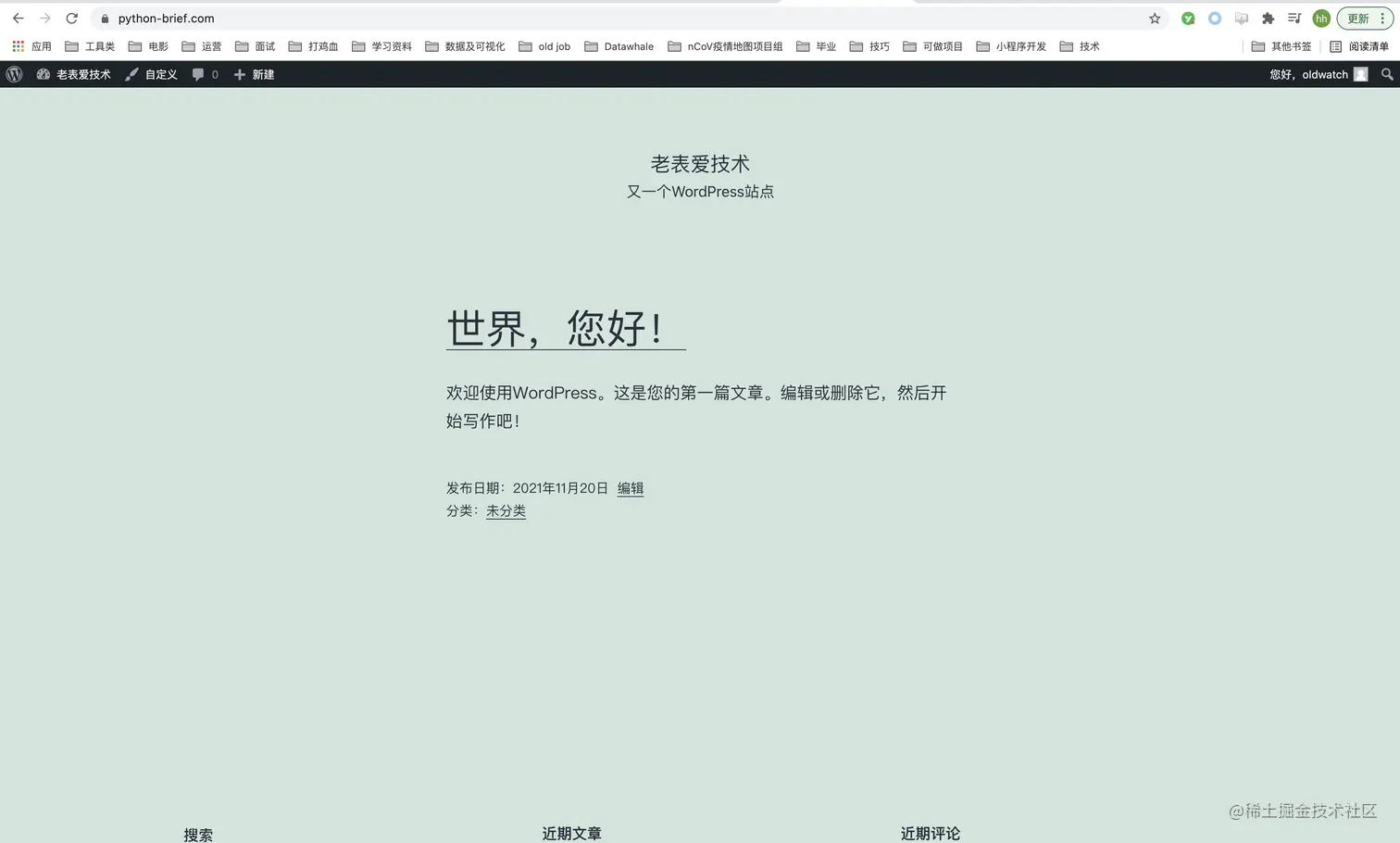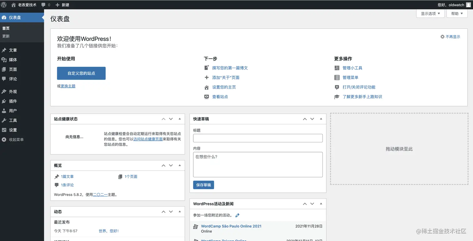 在Wordpress站点后台我们可以进行很多操作,如:更改页面主题、安装插件、发布管理文章和评论等,相比于我们之前利用Hexo搭建的博客,简直方便太多了~