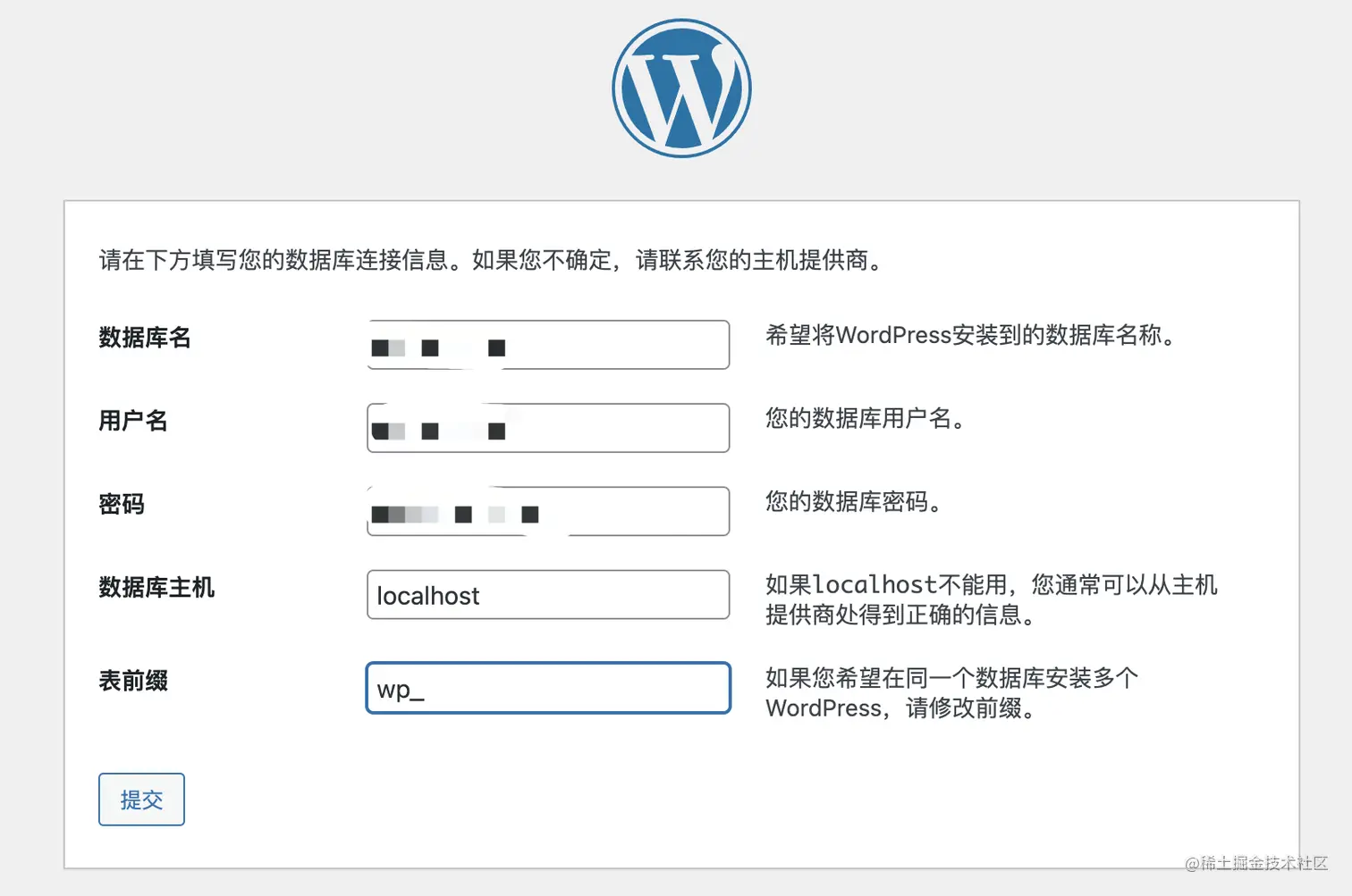 输入前面第三步建站时设置的mysql数据库名、用户名、密码,其他可以默认,然后点击提交按钮。