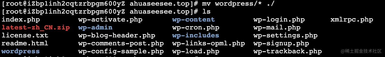 接下来,我们需要将wordpress内所有内容移动到网站目录下,直接执行下面指令即可(你也可以直接复制然后粘贴),不要输错啦~后面给大家准备一章专门介绍Linux指令,在跟老表学云服务器开发-先导篇也有介绍过一些几个基本指令: