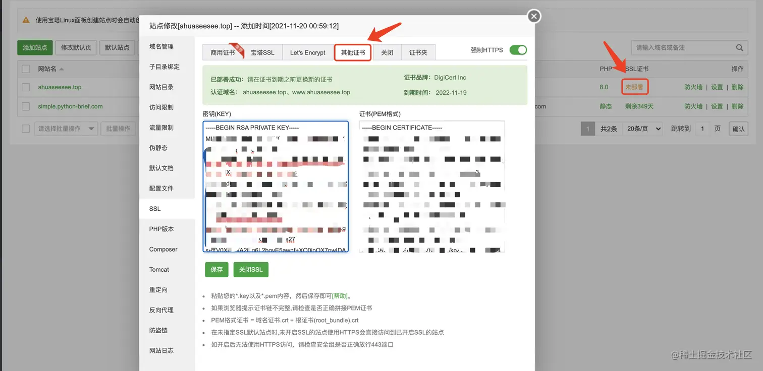 按之前宝塔建站教程,先点击未部署按钮,然后点击其他证书,将我们申请好的免费证书的证书密钥(key)和证书内容(pem)粘贴到对应位置即可,然后点击保存。(如果不知道怎么获取免费证书的,建议先看跟老表学云服务器开发的第四篇文章)