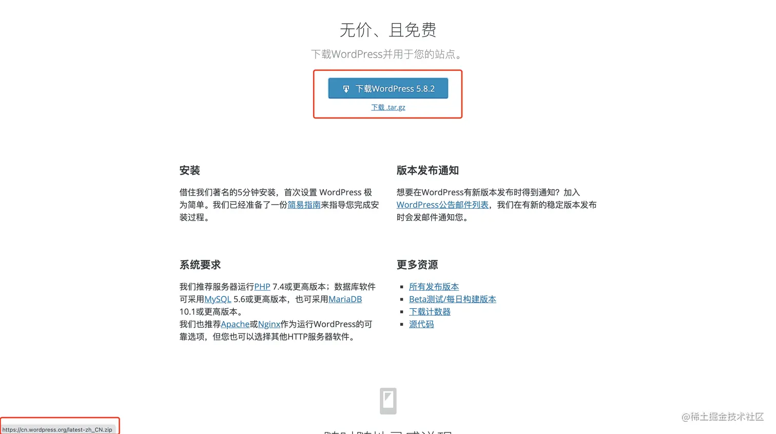 将鼠标移动到下载WordPress5.8.2上就可以看到点击后实际访问地址了,就是我们的直接下载地址。