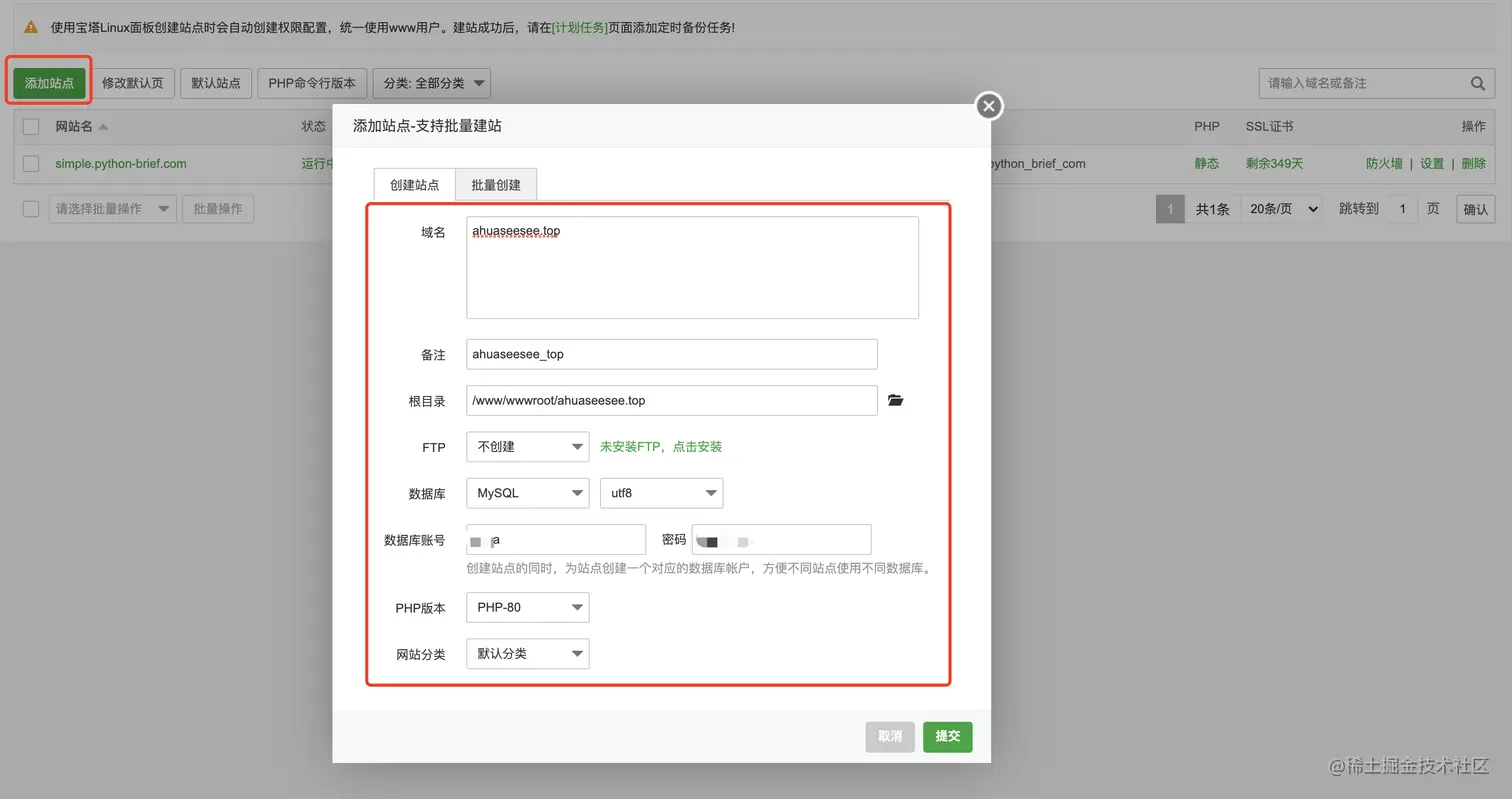 安装好PHP后,我们可以先点击网站,新建一个网站,域名就写我们自己上面写的域名,当然也可以写一个子域名(比如:blog.你的域名.top),数据库选MySQL,自己设置用户名和密码,密码建议复杂点(可以复制保存到本地,后面配置安装wordpress会用到),PHP版本选我们新安装的8.0,其他默认设置即可(可以记下你的网站根目录,后面项目源码就放在这个目录下)。