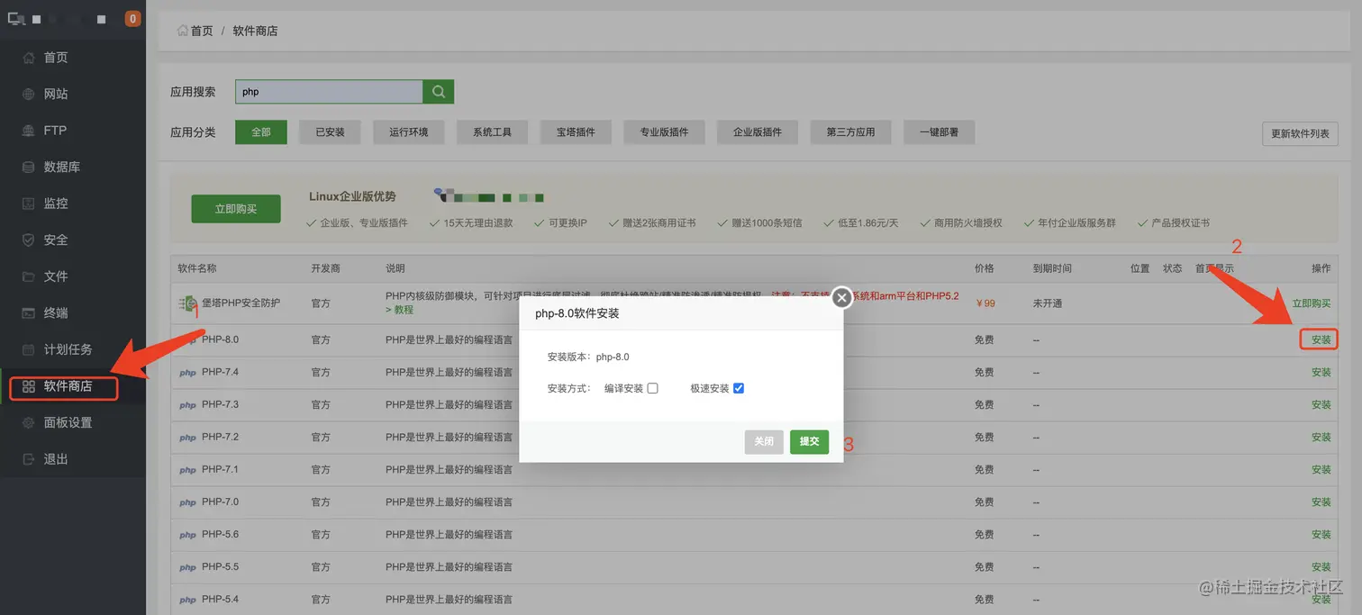 我们直接进入宝塔页面,点击软件商店,然后在应用搜索框搜索php就会出现很多php版本啦,wordpress要求php在7.4或者更高版本,所以我们这里直接选择安装php8.0版本。