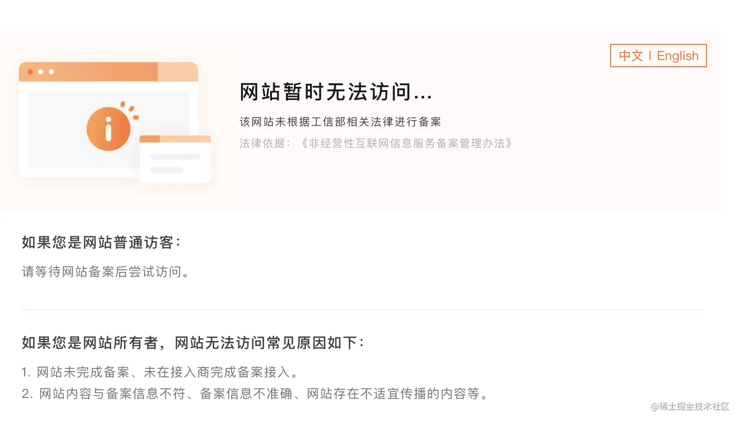 按道理我们这个时候直接访问域名,应该就可以进入到WordPress安装页面了,如果你和我一样出现下面这种情况或者直接显示无法访问,大概率是你的域名没有备案导致的。