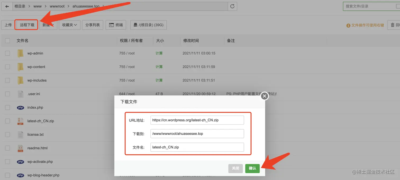 你可以选择本地下载好后,将文件再上传到服务器,又或者直接使用宝塔提供的远程下载。(关于如何利用宝塔上传本地文件或者远程下载文件还有其他宝塔基本操作,可以看跟老表学云服务器开发第三篇文章)