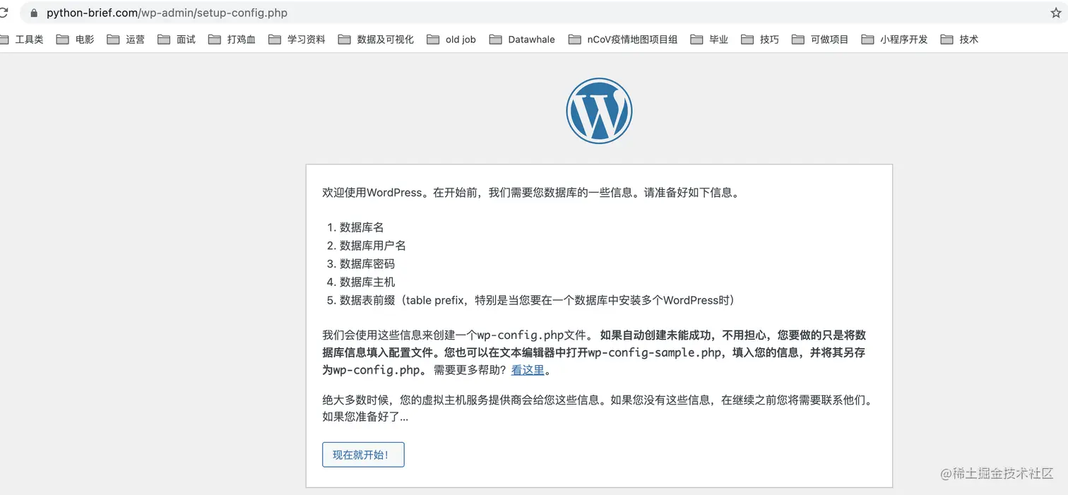备案成功后,我们直接浏览器访问域名就可以跳转到wordpress安装设置页面了,直接点击现在就开始。(这里为了方便演示,我直接用的之前已经备案好的域名)