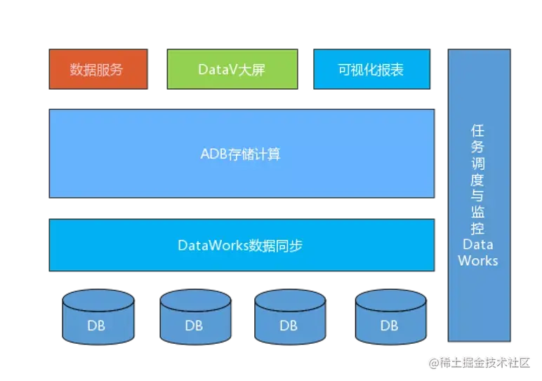 数据源是阿里云的PolarDB、MySQL、RDS等数据库,采用阿里云的DataWork数据同步,把增量数据实时同步到ADB中,然后在ADB中做数据实时的计算,数据的任务调度在DataWork中完成。