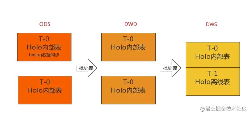 对于一些数据量小的表,依赖于Hologres强大的Join能力,通过视图来构建DWS中间层,如下图所示: