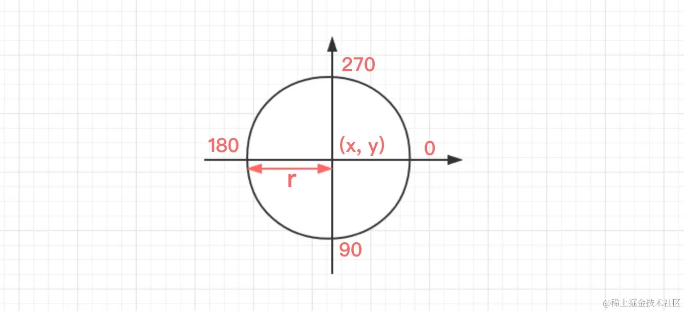 如果要绘制圆形,那么起始角度为 0,结束角度为 360 即:Math.PI / 180 **360 度 等同于 Math.PI 2