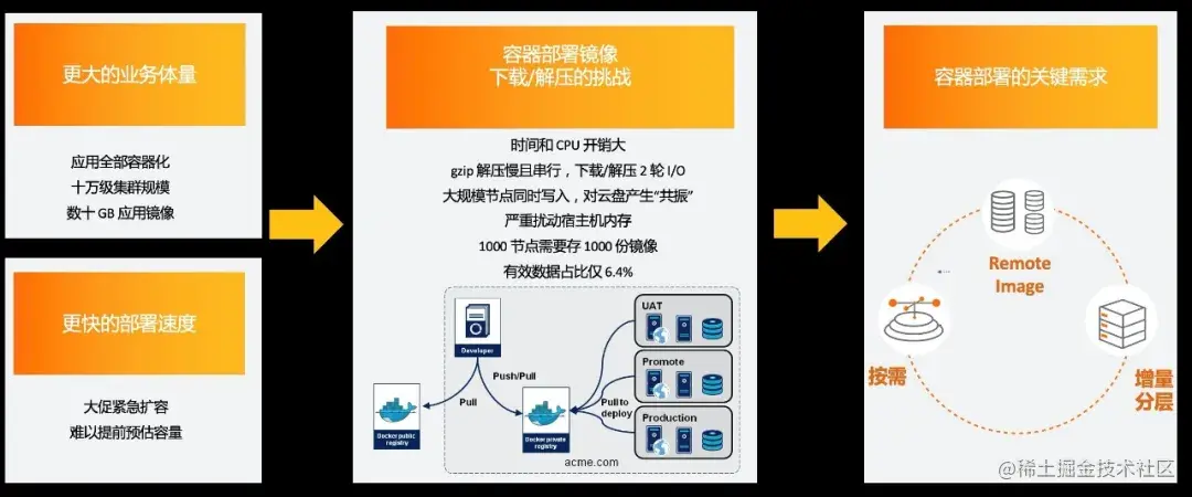 3、然而大规模的创建或者更新容器集群依然很慢,主要原因是容器部署镜像的下载和解压很慢,主要的技术挑战如下: