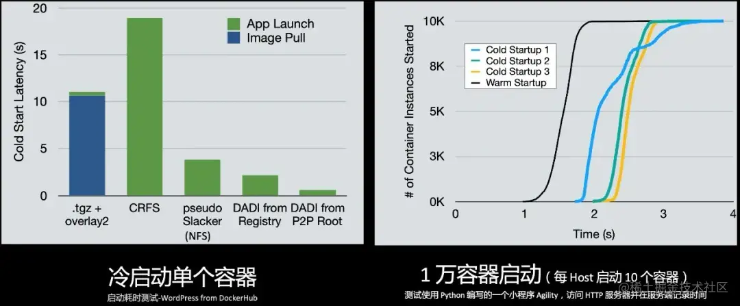 我们在公共云上创建了 1000 个 VM,并将他们用做容器的主机。在每个主机上启动 10 个容器,总共 10000 个容器。测试使用 Python 编写的一个小程序 Agility,访问 HTTP 服务器并在服务端记录时间。如右图所示,结果表明 DADI 的冷启动在 3 秒之内快速完成。