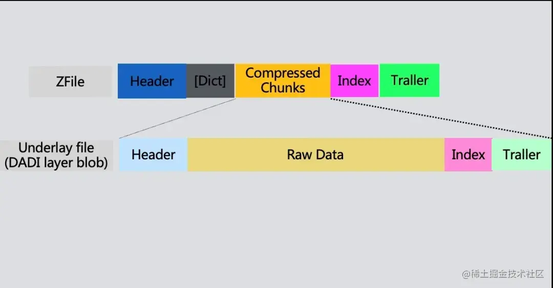 标准压缩文件格式,例如 gz,bz2,xz 等,无法高效的进行随机读写操作,无论读取压缩文件中的哪一部分,都需要从头部开始解压,为了支持 layer blob 的压缩并同时支持远程镜像的按需读取,DADI 引入了 ZFile 压缩格式。ZFile 的压缩格式如下图所示,按固定大小数据块压缩,只解压读到的数据块,支持多种有效的压缩算法,包括 lz4,zstd,gzip 等,采用通用格式,不绑定于 DADI。