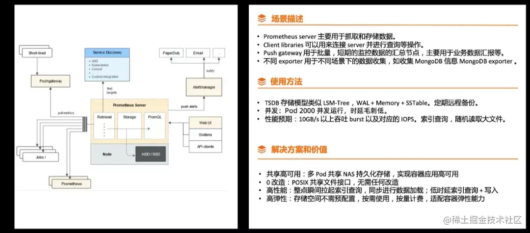Prometheus 的核心存储 TSDB ,类似 LSM tree 的存储引擎。我们看到一个趋势,存储引擎多节点数据同步,需要引入 Paxos 一致性协议。中小型客户在管理引擎的时候,管理一致性协议的时候难度非常大,架构将计算和存储分离,计算是无状态的,TSDB 的存储的引擎释放给分布式文件系统,天然需要 NAS 共享文件系统。