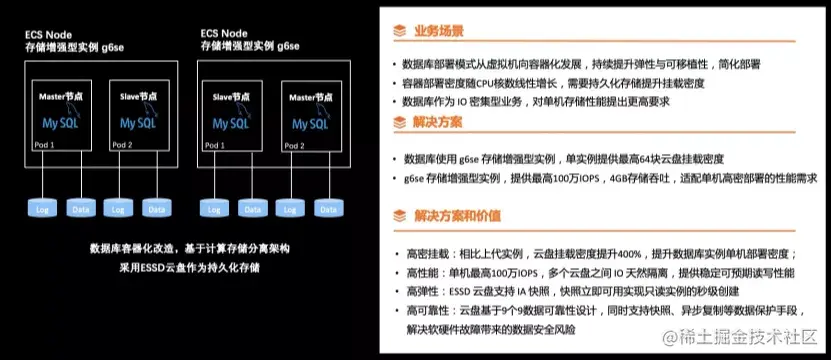 我们的解决方案是数据库使用 g6se 存储增强型实例,单实例提供最高 64 块云盘挂载密度,g6se 存储增强型实例,提供最高 100 万 IOPS,4GB 存储吞吐,适配单机高密部署的性能需求。 数据库容器化使用 ESSD 云盘高密挂载的优势是: