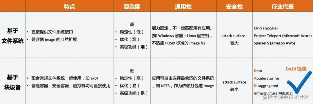 Remote Image 主要有两种技术实现的方式,一种是基于文件系统,第二种是基于块设备。Remote Image 技术方案对比如下图所示: