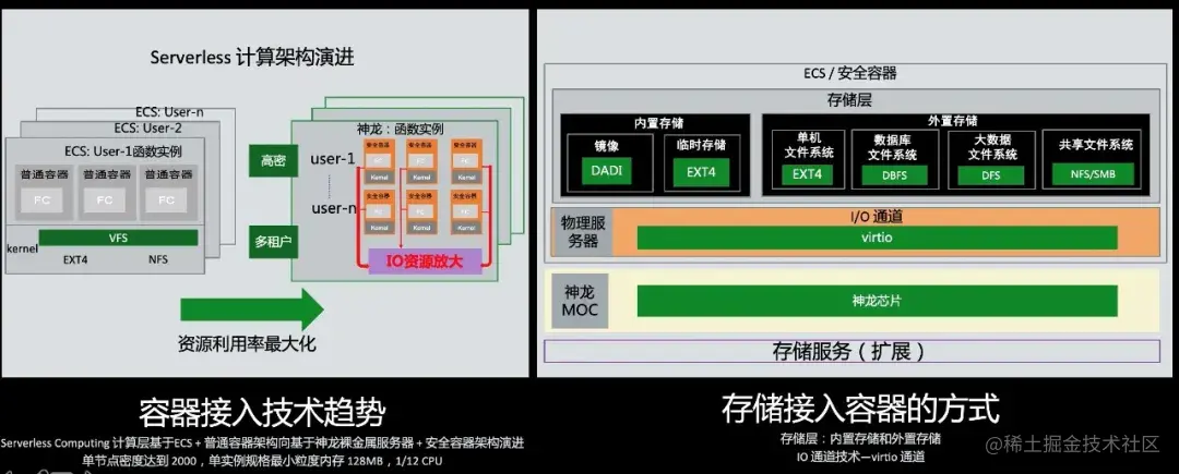 上面我们谈到了 Serverless 应用架构的新范式,现在我们看到一个趋势,从虚拟机到普通容器,再逐渐演变为神龙裸金属部署安全容器。从存储的布局角度来看,其面临的显而易见的挑战是更加高密和多租户。