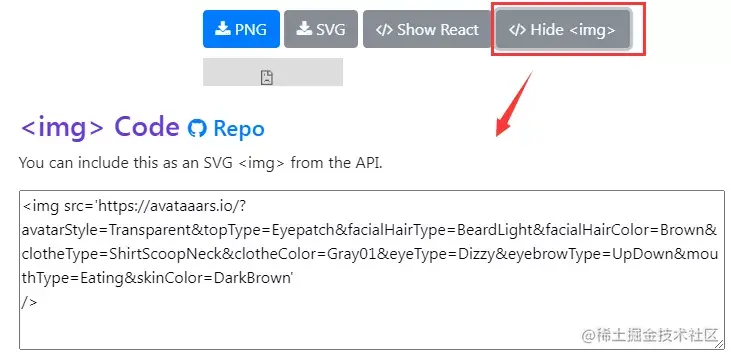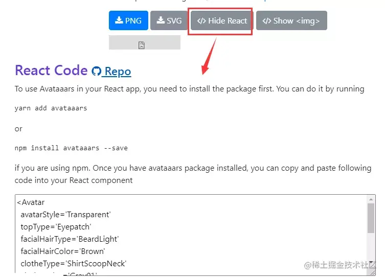 设置好头像后,可点击“show react”生成React代码: