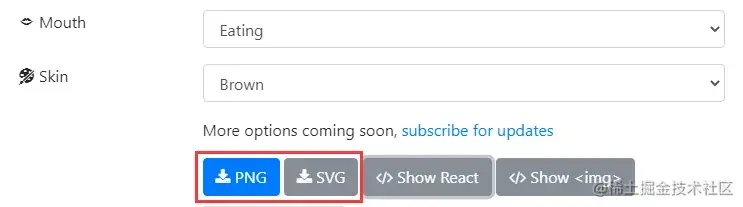 定制完成后,可将头像导出成 PNG 和 SVG 格式的图片,或把头像代码内嵌到个人网站上。