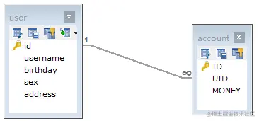 这里用一个例子来演示说明一对多查询,【老规矩,代码在文末】。用户为User 表,账户为Account表。一个用户(User)可以有多个账户(Account)。具体关系如下: