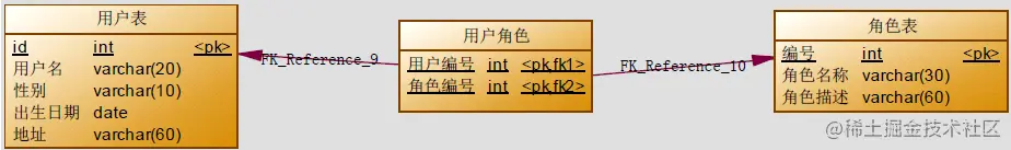 在MySQL 数据库中添加角色表,用户角色的中间表。