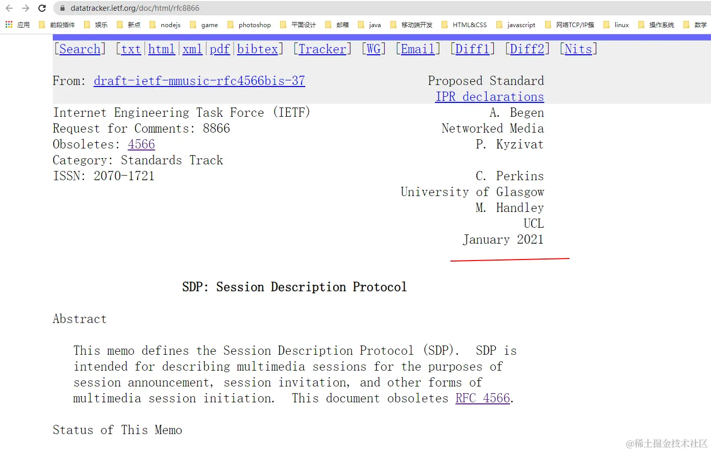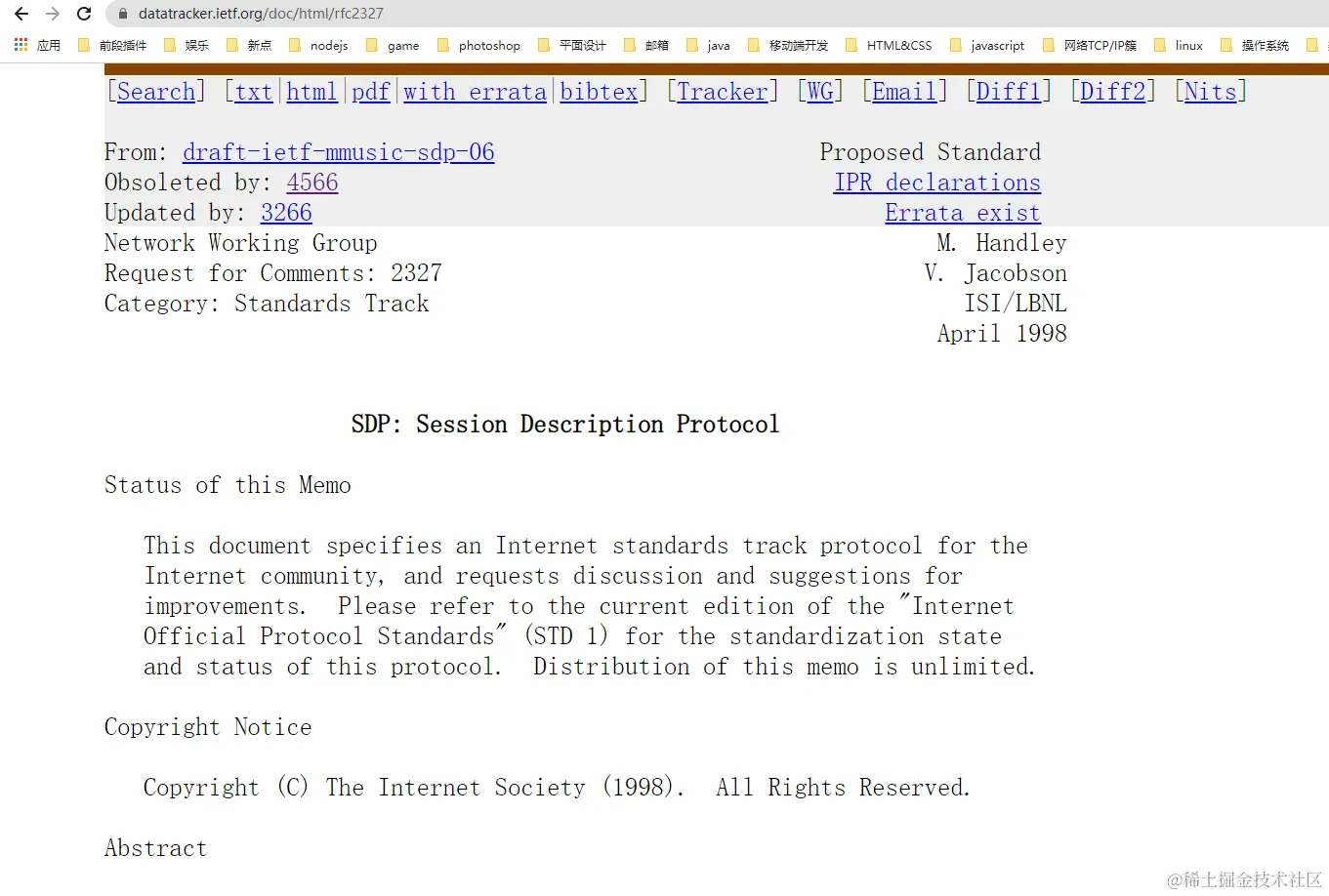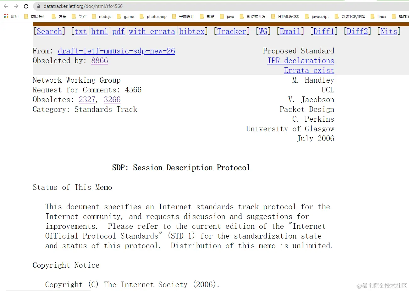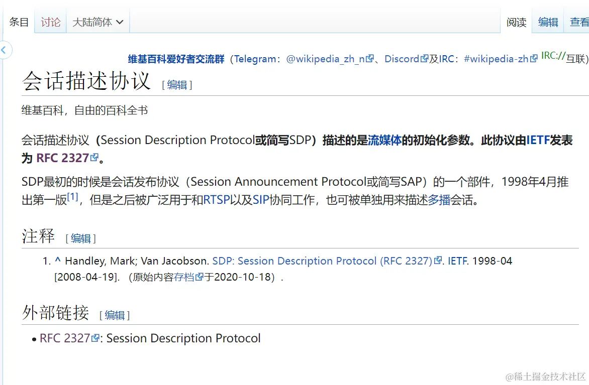 如何查阅 SDP 最新资料 MegaWenix 2021-12-02 108 阅读1分钟 1. google sdp 2. 进入 sdp wiki 3. 点击上图的 RFC 2327 4. 点击上图的 Obsoleted by: 4566 5. 点击上图的 Obsoleted by: 8866