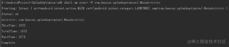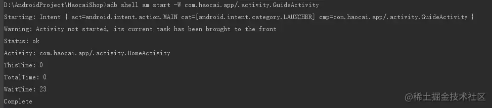 例: adb shell am start -W com.haocai.app/.activity.GuideActivity